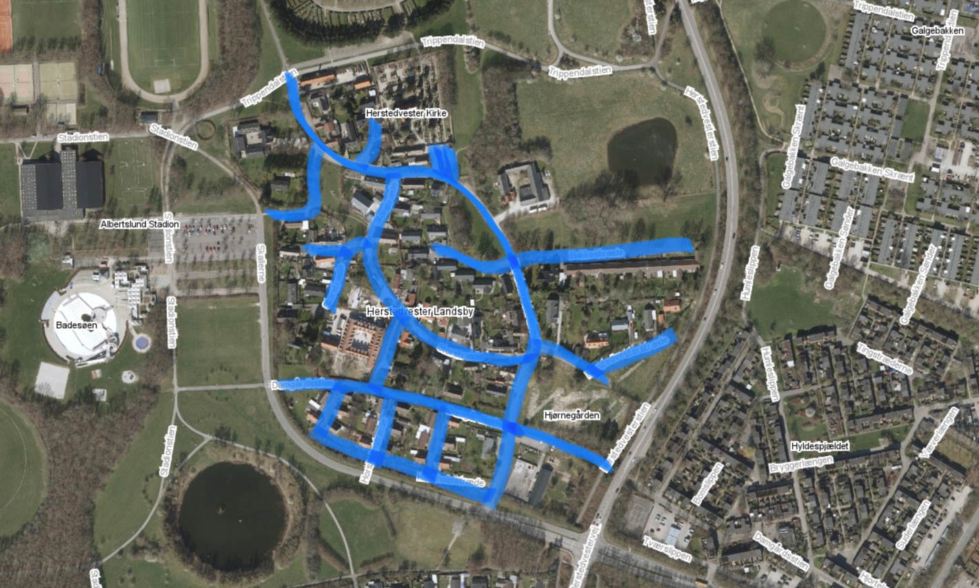 Billedet viser hvor der etableres ny udebelysning i Herstedvester.
